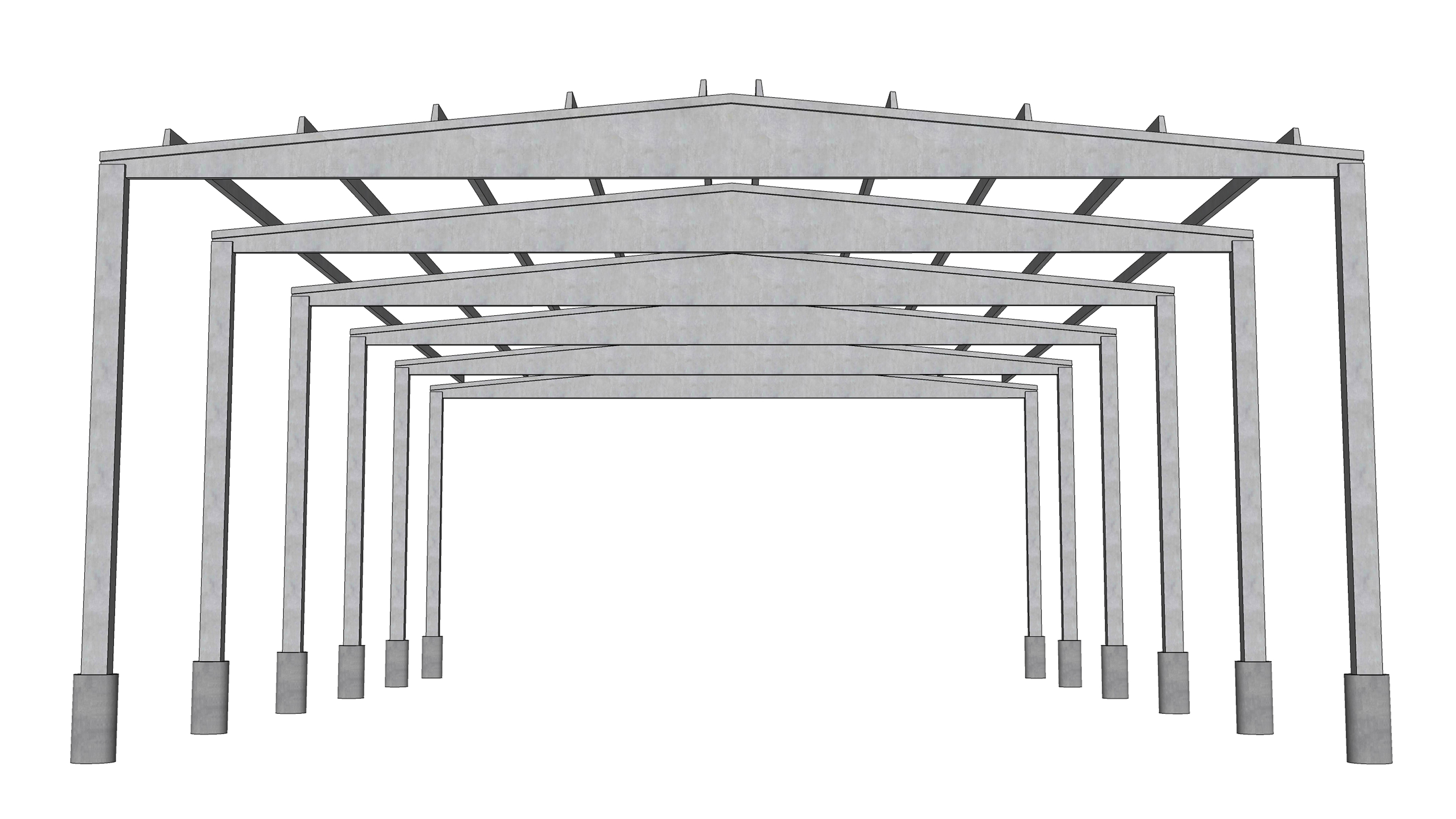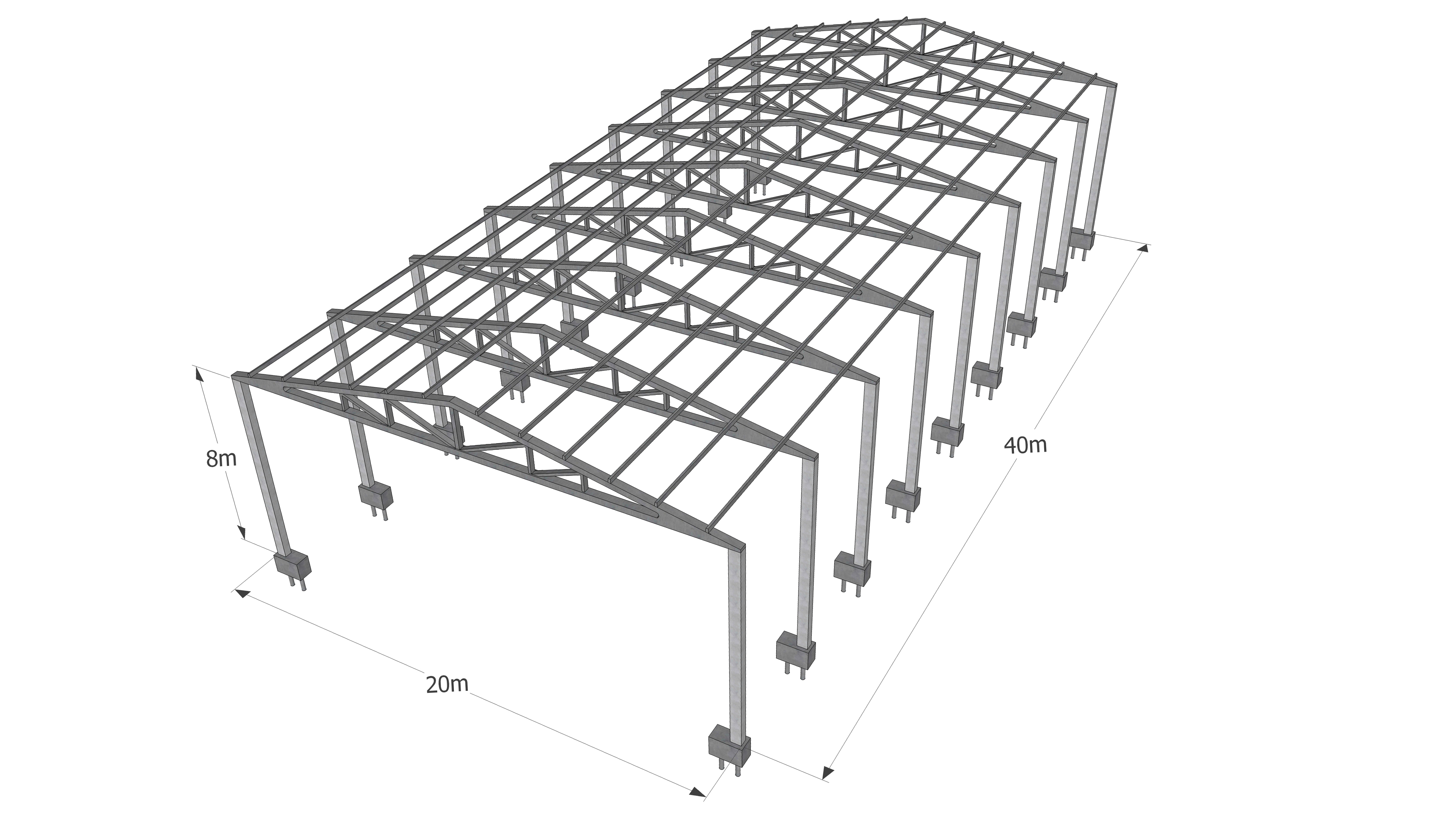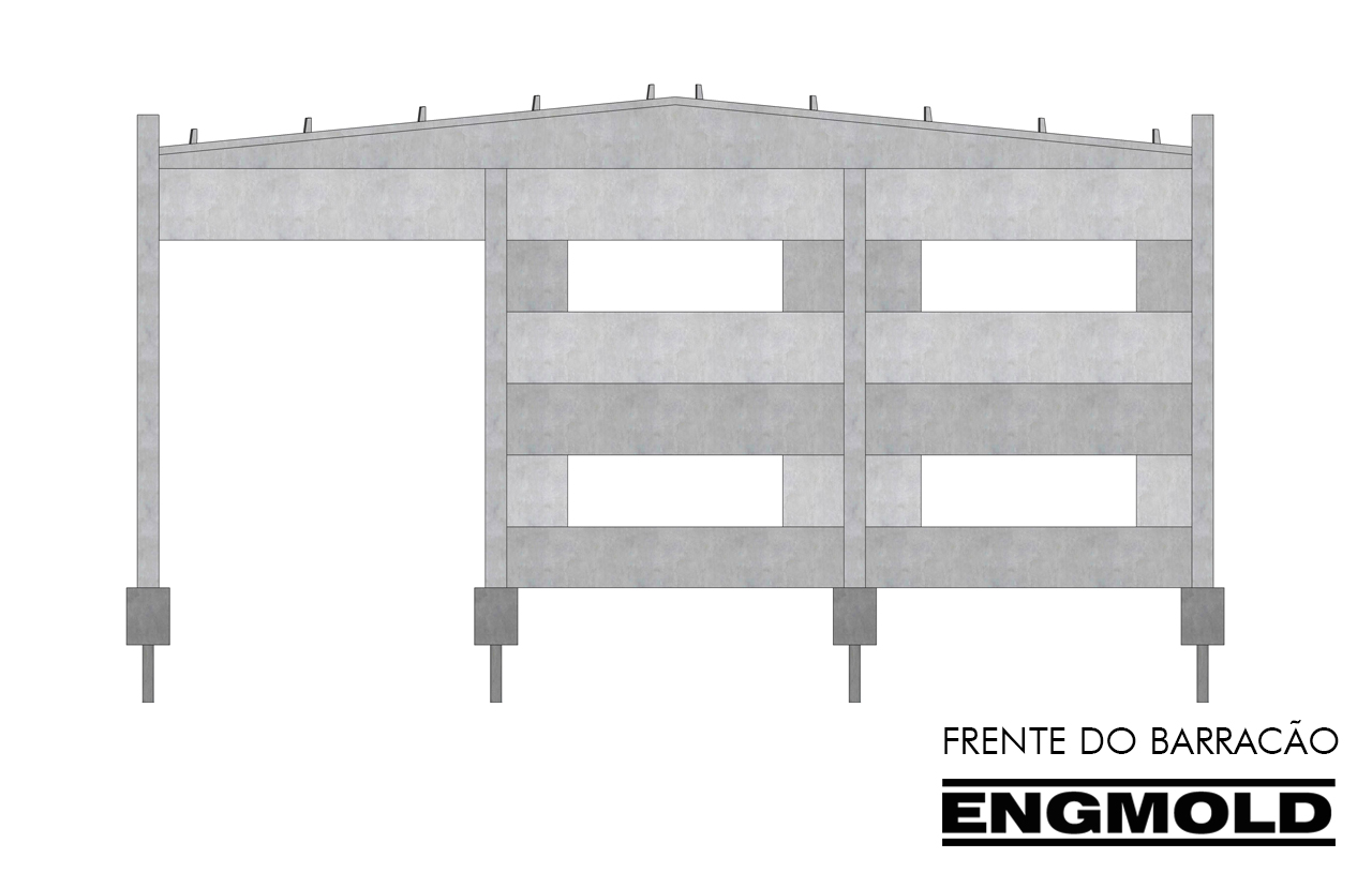 Cobertura pré-moldada medindo 20x40 m, composta por vigas de cobertura, terças e pilares pré-moldados de concreto com pé-direito de 8,00 m.