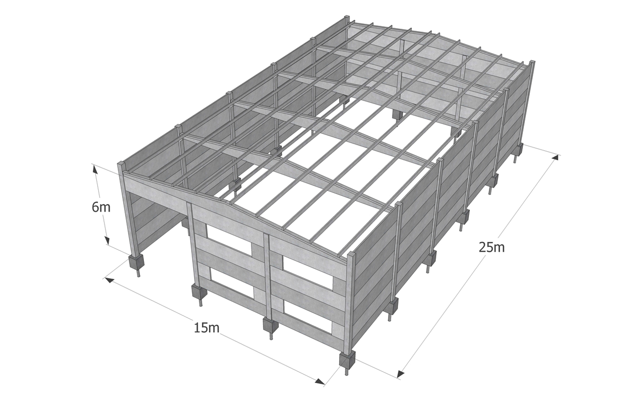 Cobertura pré-moldada medindo 15x25 m, composta por vigas de cobertura, terças, pilares e painéis de fechamento (parede de vedação) pré-moldados de concreto com pé-direito de 6,00 m.
