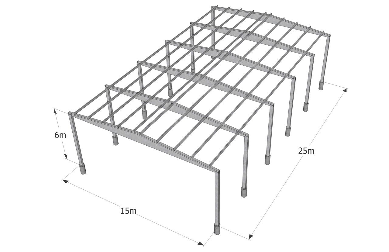 Cobertura pré-moldada medindo 15x25 m, composta por vigas de cobertura, terças e pilares pré-moldados de concreto com pé-direito de 6,00 m.